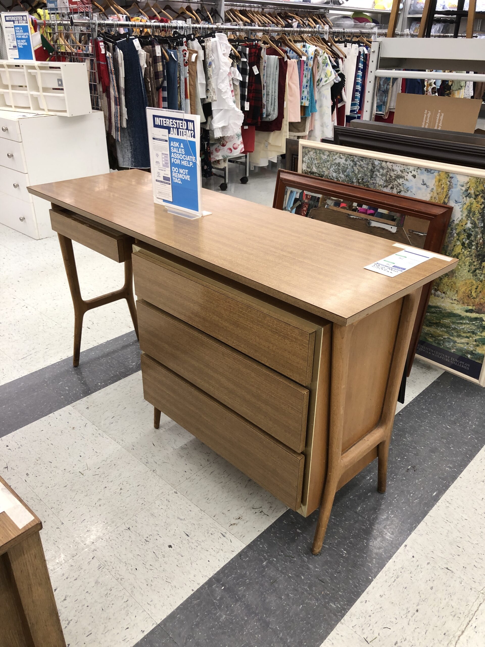 This midcentury desk caught my eye, but was priced at $60 and the top surface was a plastic laminate. Definitely groovy and I could likely sell it for more than sixty bucks, but too much of an initial investment.