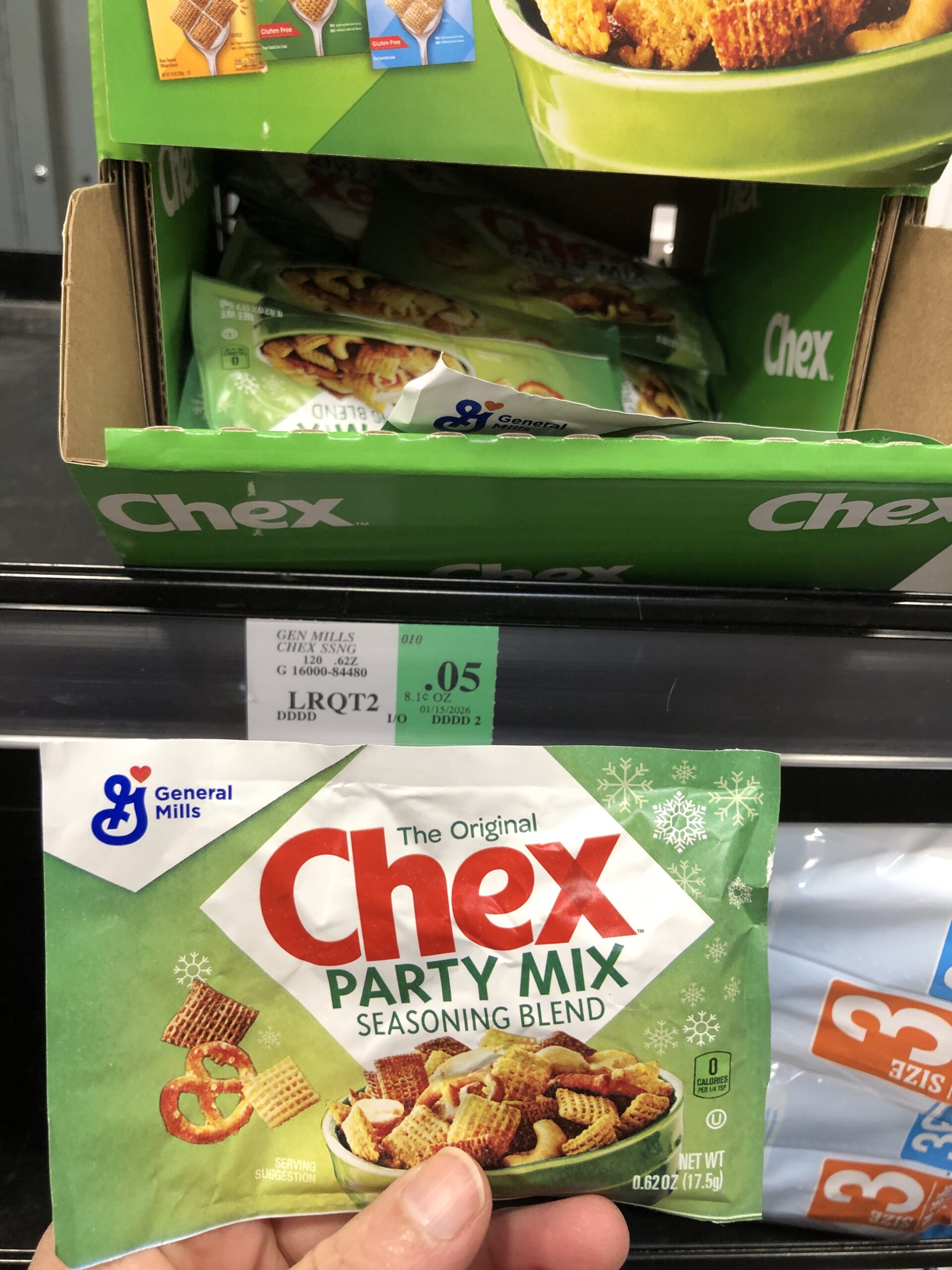 - I nabbed two 5¢ packages of Chex mix seasoning from the clearance shelf. I thought it might be yummy sprinkled over popcorn. I'll let you know.