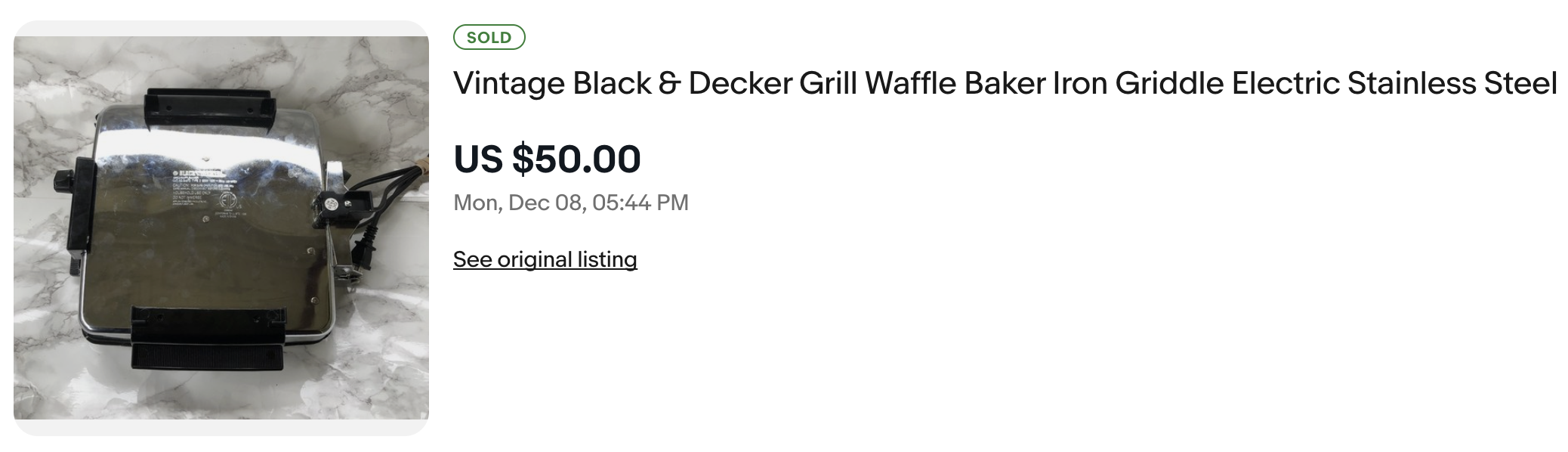 5. I also sold the vintage waffle iron that I listed on eBay a couple months ago. Creating the proper size Frankenbox just about broke me, but I eventually prevailed. (I'm able to scavenge enough shipping supplies to never have to buy any.) I dropped it at the post office, as it was too bulky for the normal porch pickup that I normally arrange through the USPS website. It's important that the mail carrier not absolutely loathe me!