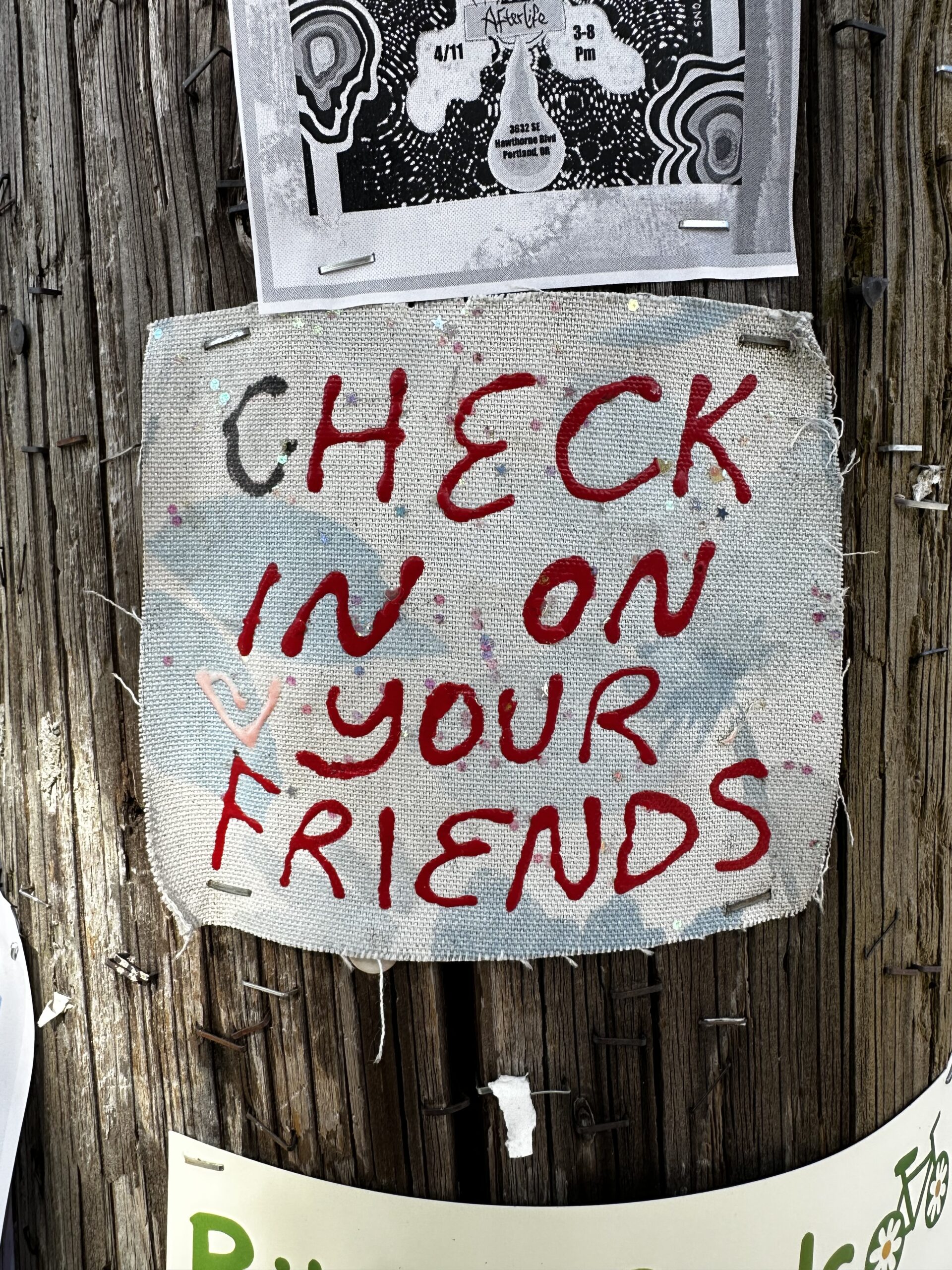 5) My sister and I found this message on a telephone pole and I snapped a photo, which I later texted to a couple friends. It worked, as it gave me the opportunity to catch up with people.