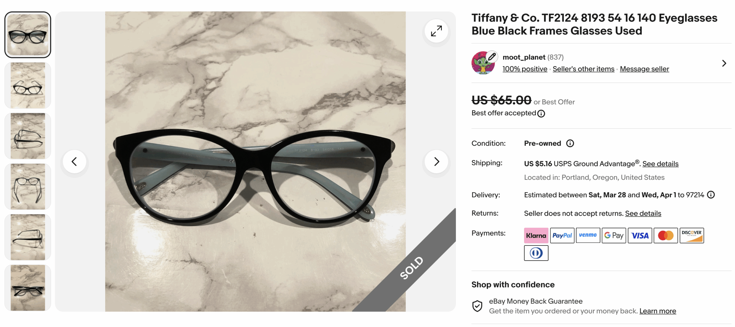 1. I accepted a $55 offer on the Tiffany & Co. glasses frames that I thrifted for the $100 Goodwill Gift Card Challenge, which is extra special as I sourced them from the pay-by-the-pound bins! I'd estimate that I spent 25¢ on them.