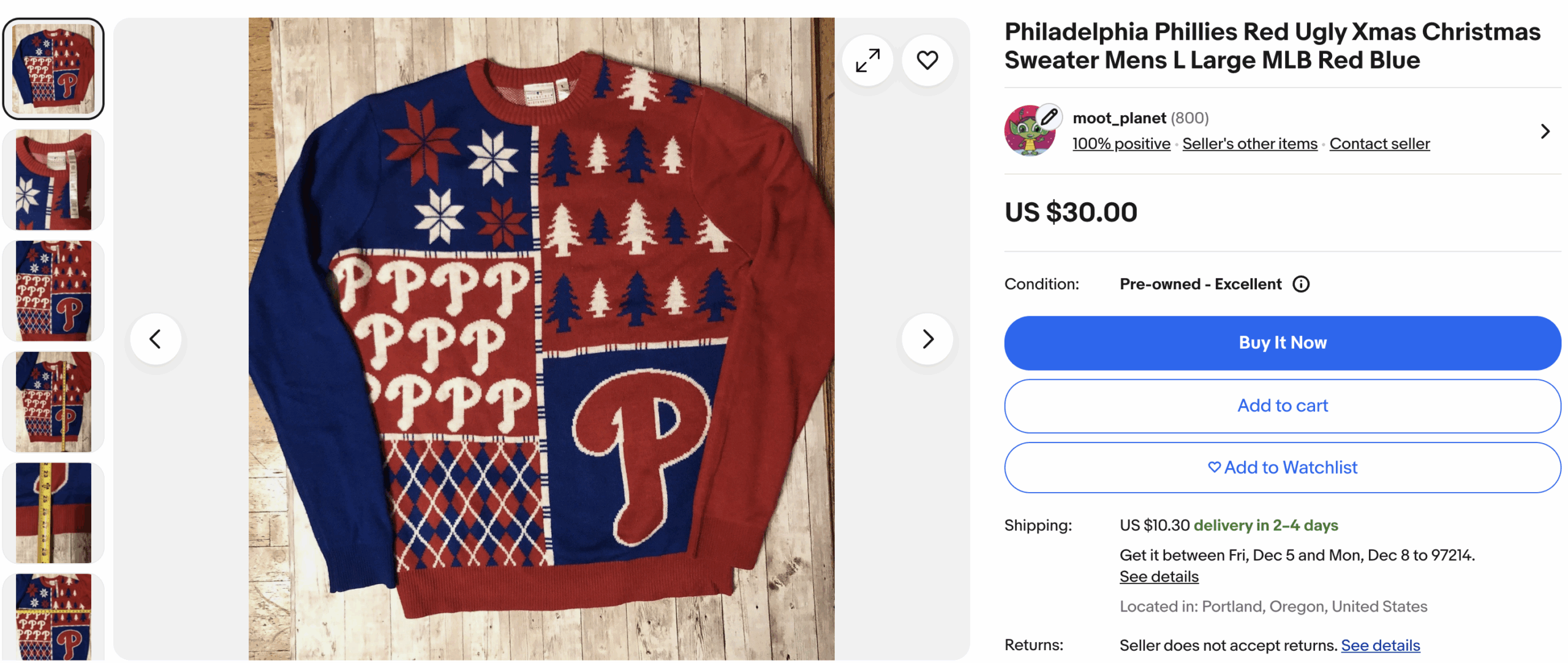 3. I listed a thrifted Philadelphia Phillies Christmas sweater on eBay that I set aside last year, as my 2024 husband wanted to keep it. 2025 husband feels indifferently, so I used yesterday's $200 Christmas sweater sale as inspiration to get this one up on eBay. I priced it at just $30, but that's still better than the $0 it was earning folded up on a shelf in our spare bedroom.