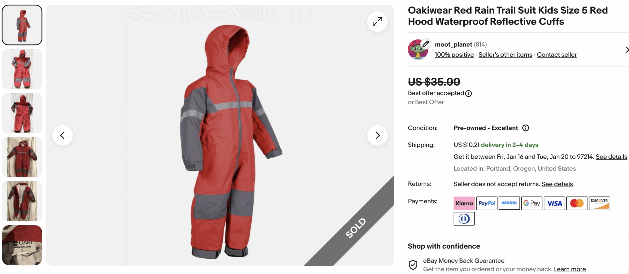 - The Oakiwear kids' rainsuit, which I also picked up at the bins, as it was lightweight and sells new for $90. (The sweet spot when you pay by the pound!) I took an offer at $28 and I earned $27.85 after eBay fees. I accidentally earned a few extra bucks on shipping, which I don't fret about as it balances out when I accidentally undercharge on shipping.