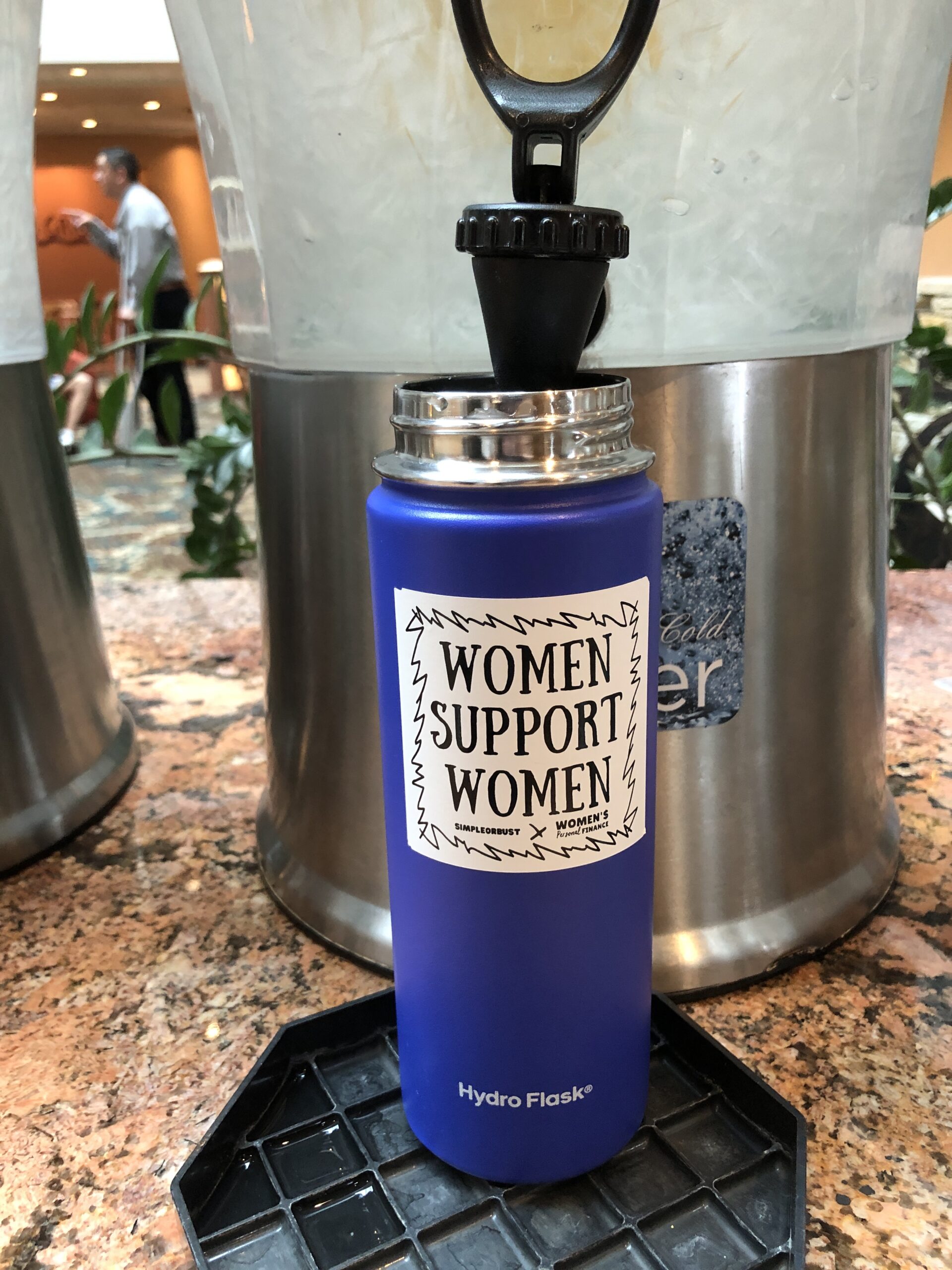 2. Our hotel room offers $5 bottles of water, but I'll ignore their existence as there's handy free ice water dispensers in the lobby. Perfect opportunity to show off my "Women Support Women" sticker from Women's Personal Finance.