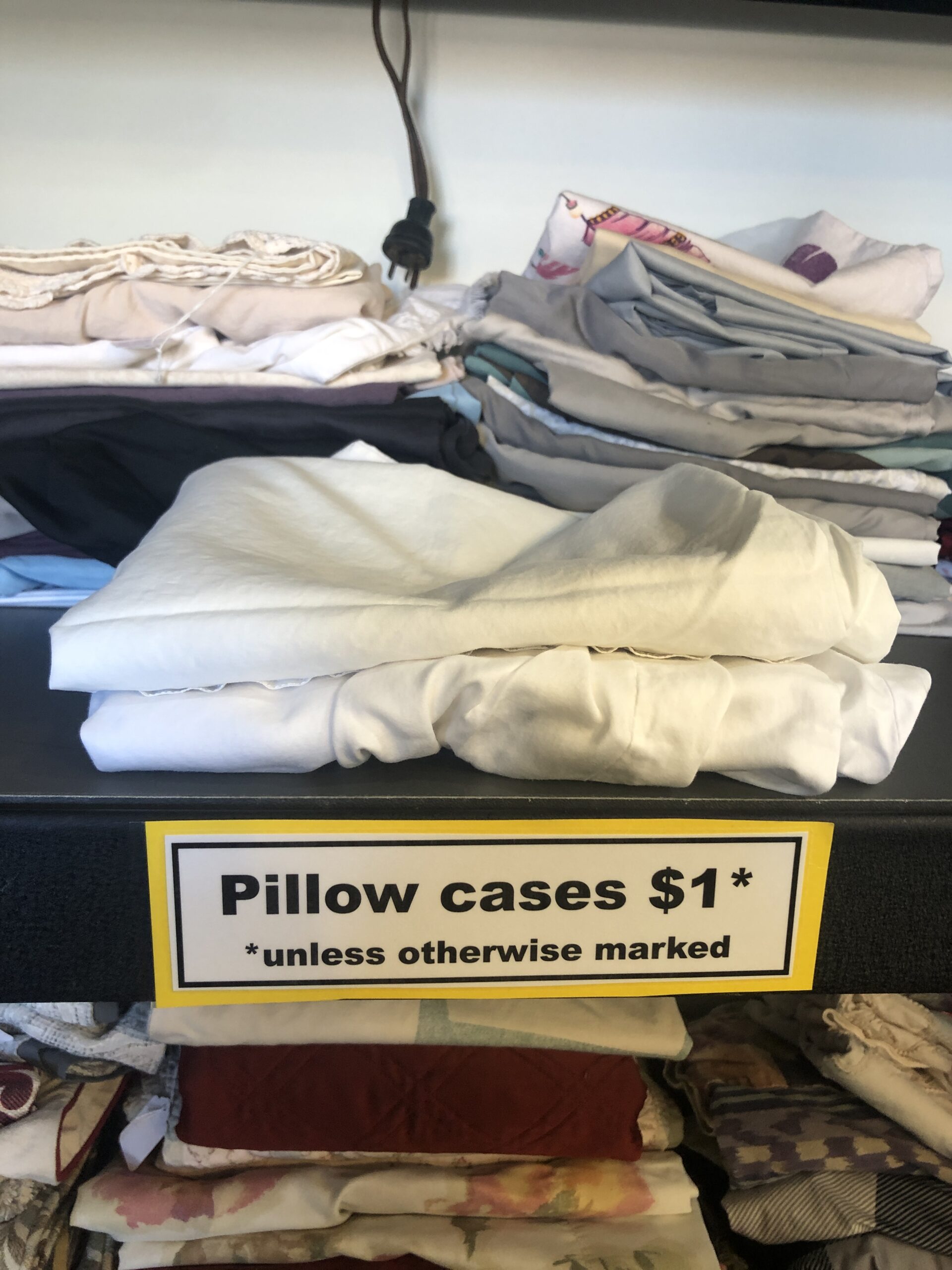 It was kismet, as a couple of my white cotton pillow cases are fraying most annoyingly. Yes, I've been mending them, but had put a note in my brain to keep an eye out for extras. This pair of pillowcases set me back two entire dollars and were 100% cotton and seemed to be high quality.