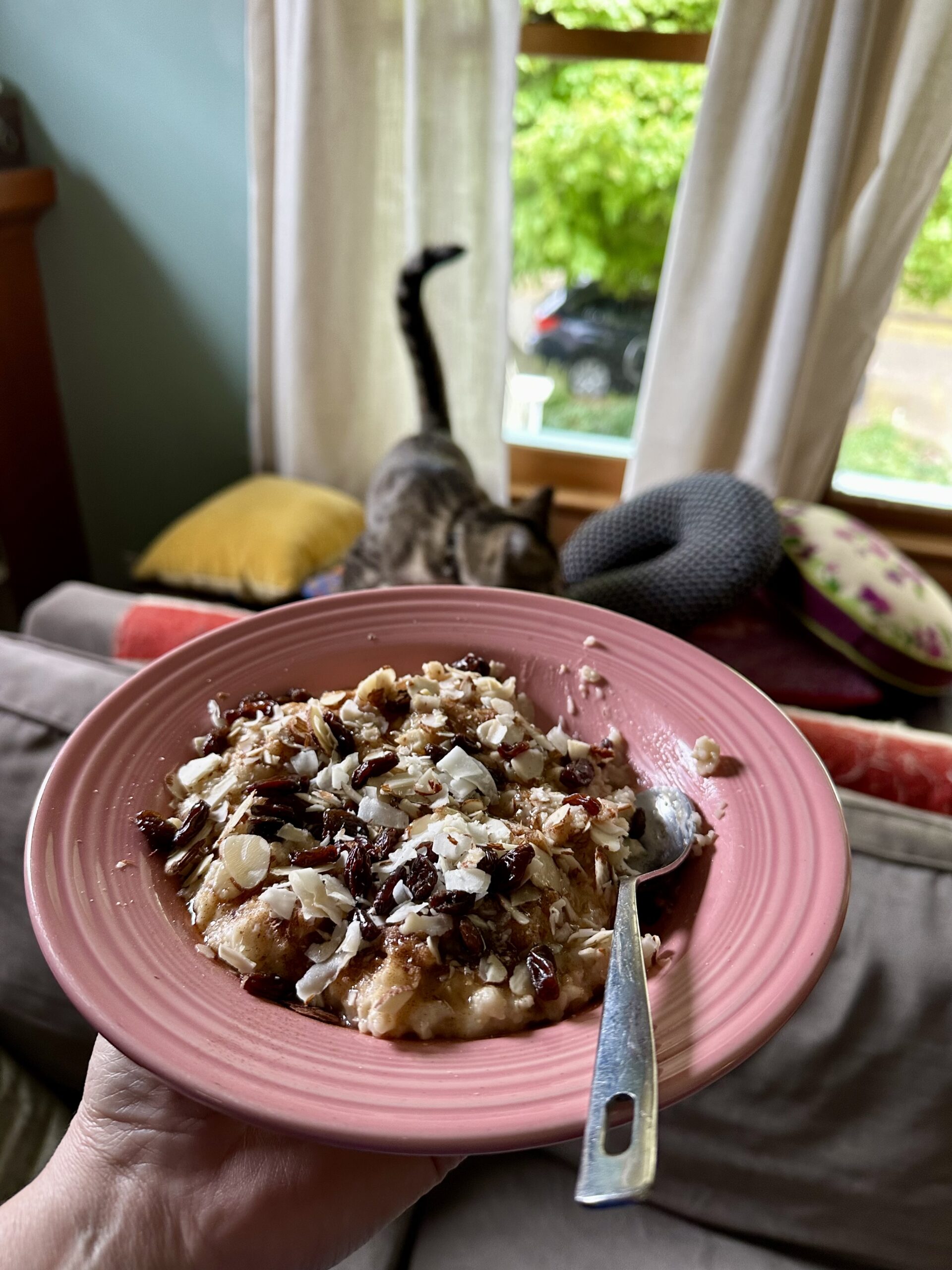 4) I continue to enjoy fancy oatmeal buffet breakfasts, even though my houseguests have returned to the east coast. Everything here is from the Winco bulk bins, which makes it extra satisfying!