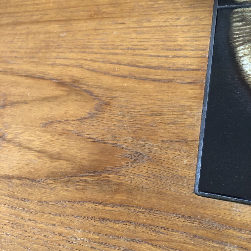 That method? Running an iron on the lowest setting over a towel until the moisture steamed out of the wood. I was nervous that I’d further damage the table, but it worked like a charm!