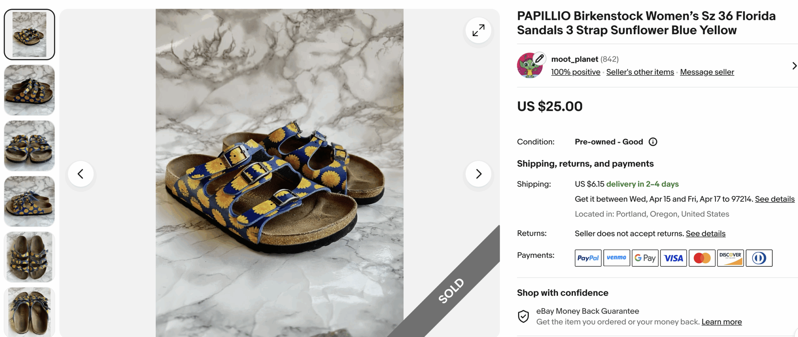 1) I sold the floral Birkenstocks that I thrifted from the bins the other day. I'd listed them for $25 but accepted a $20 offer, which adds another $17.04 to my monthly Oregon Food Bank donation.
