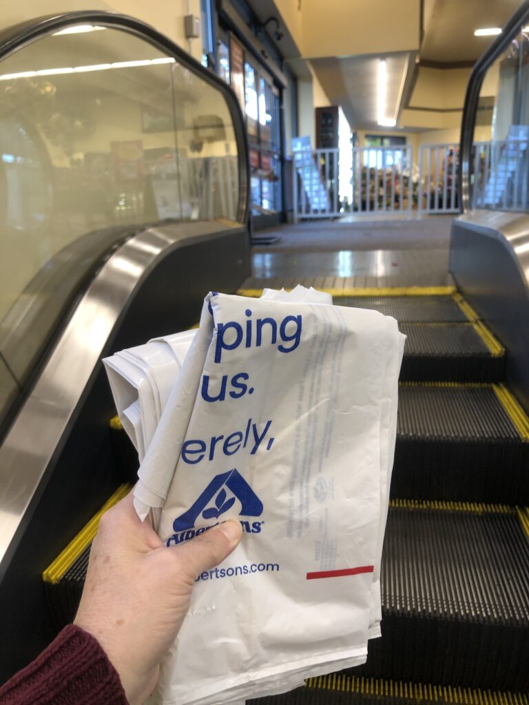 I also pulled a dozen or so thick plastic bags from the Safeway recycling bin, as they're the perfect size to line my small kitchen wastebasket. (It's hard to get ahead financially when all your money is tied up in bin liners.) Plus I needed a bag for my groceries, so I saved myself a dime.