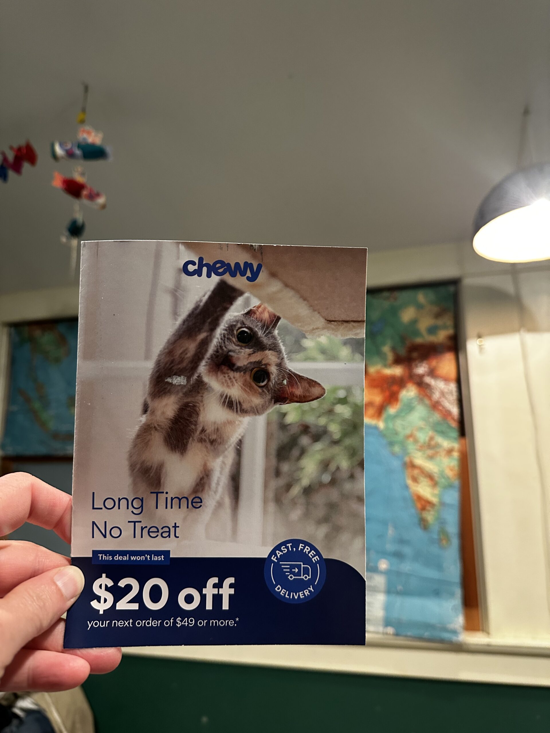 2) I got a $20-off-$49 Chewy coupon in the mail and although I no longer have a pet, my kids do. I know that my youngest occasionally orders from Chewy, so I texted them the code.