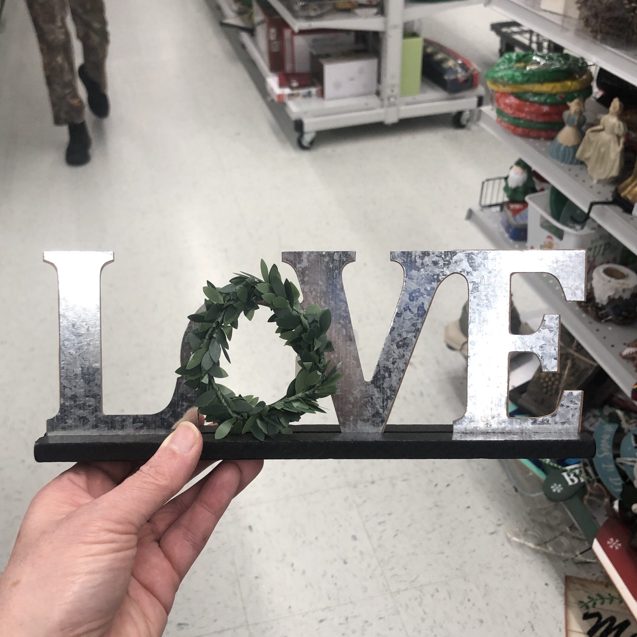 What do you see when you look at this cheesy "LOVE" Christmas $1.99 Goodwill item? A darling lil' something to brighten up your mantle, maybe a sweet loving sentiment to share with guests?