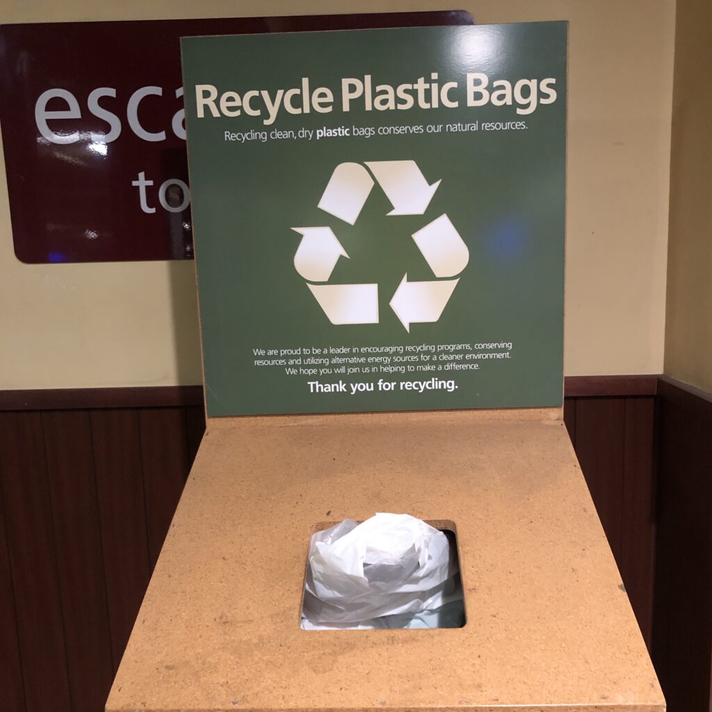 I grabbed a couple thick plastic bags from this Safeway recycle container to reuse as kitchen bin liners.