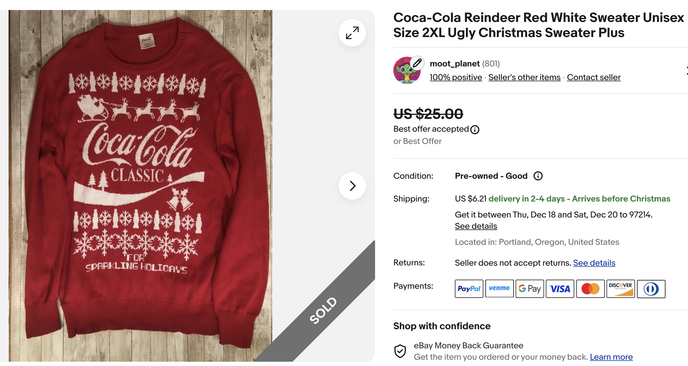 2. I sold a Coca-Cola Christmas sweater on eBay for $20 that I listed back in ye olde times of 2021! This is actually the very last Christmas sweater I had up for sale, which is fantastic as holiday specific things really only sell for me in November and December. Good to clear out all my stale inventory!
