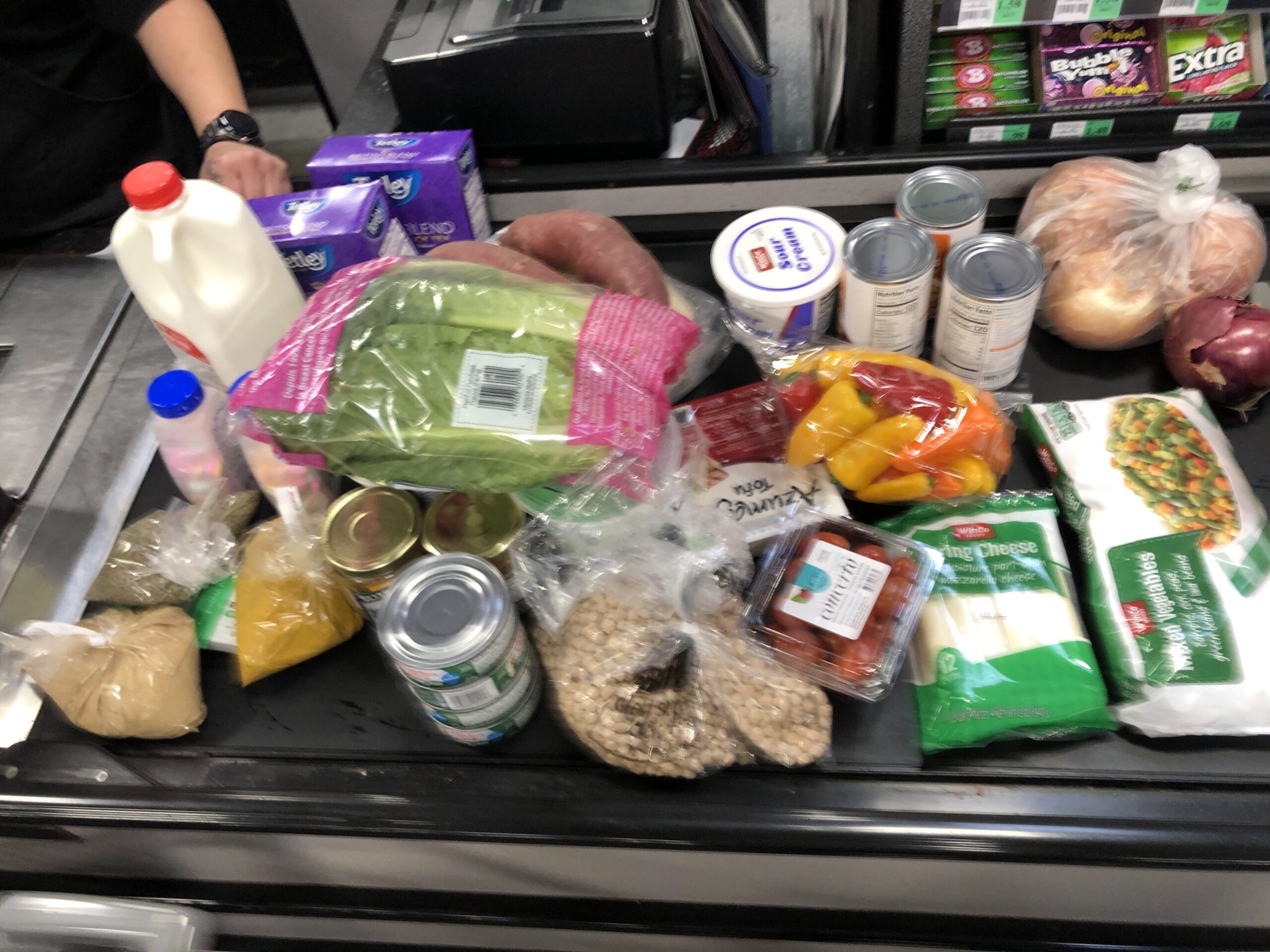 We finally made it to the main event -- Winco Foods! I was too tired to set up a standard "grocery haul" photo, so you'll just have to make do with this blurry conveyer belt image. Not visible in the picture is a 32-ounce tub of Fage yogurt, two jars of gravy from the clearance shelf, a 48-pack of tortillas and three cans of refried beans. The bulk bags contain curry powder, ginger powder, thyme and garbanzo beans.
