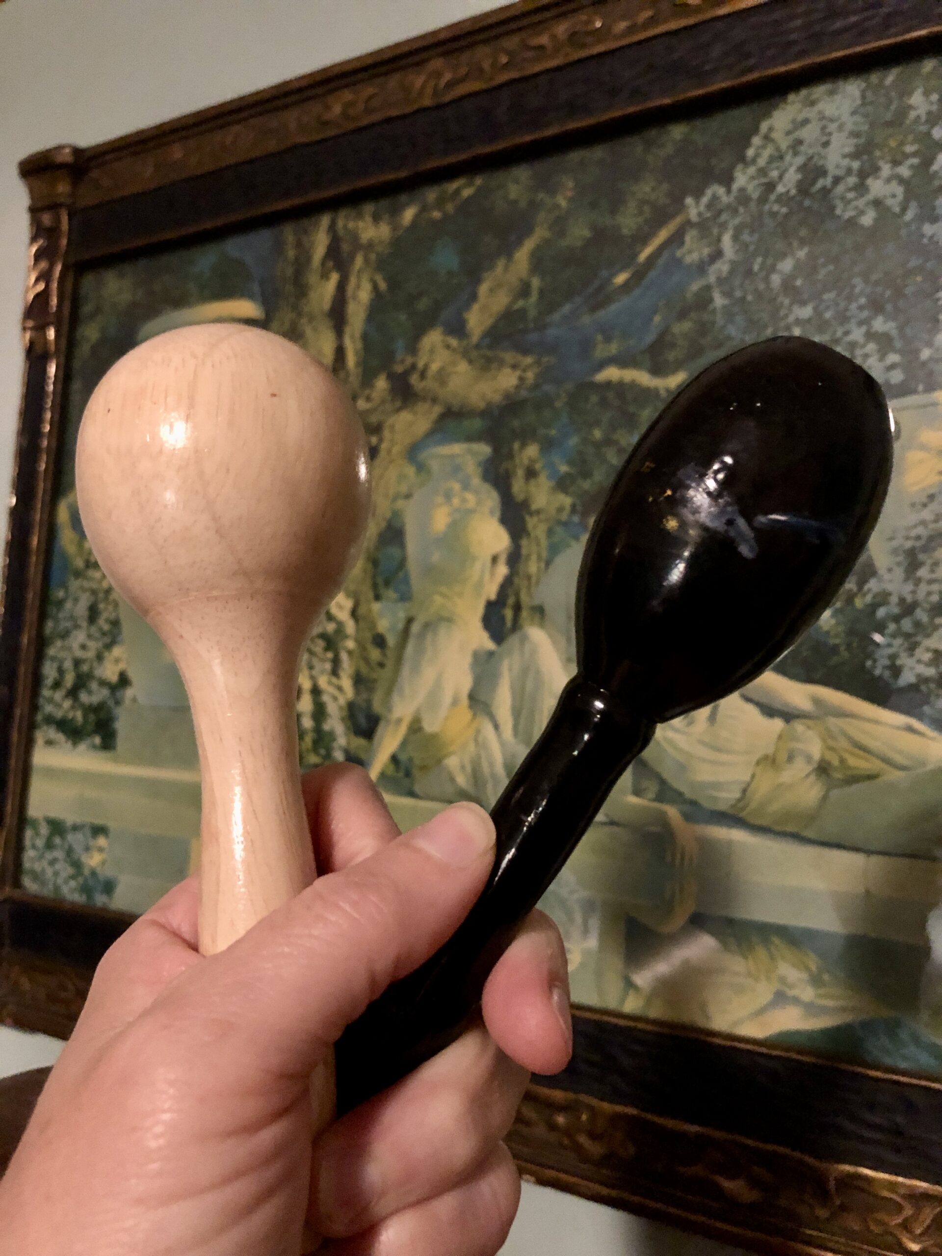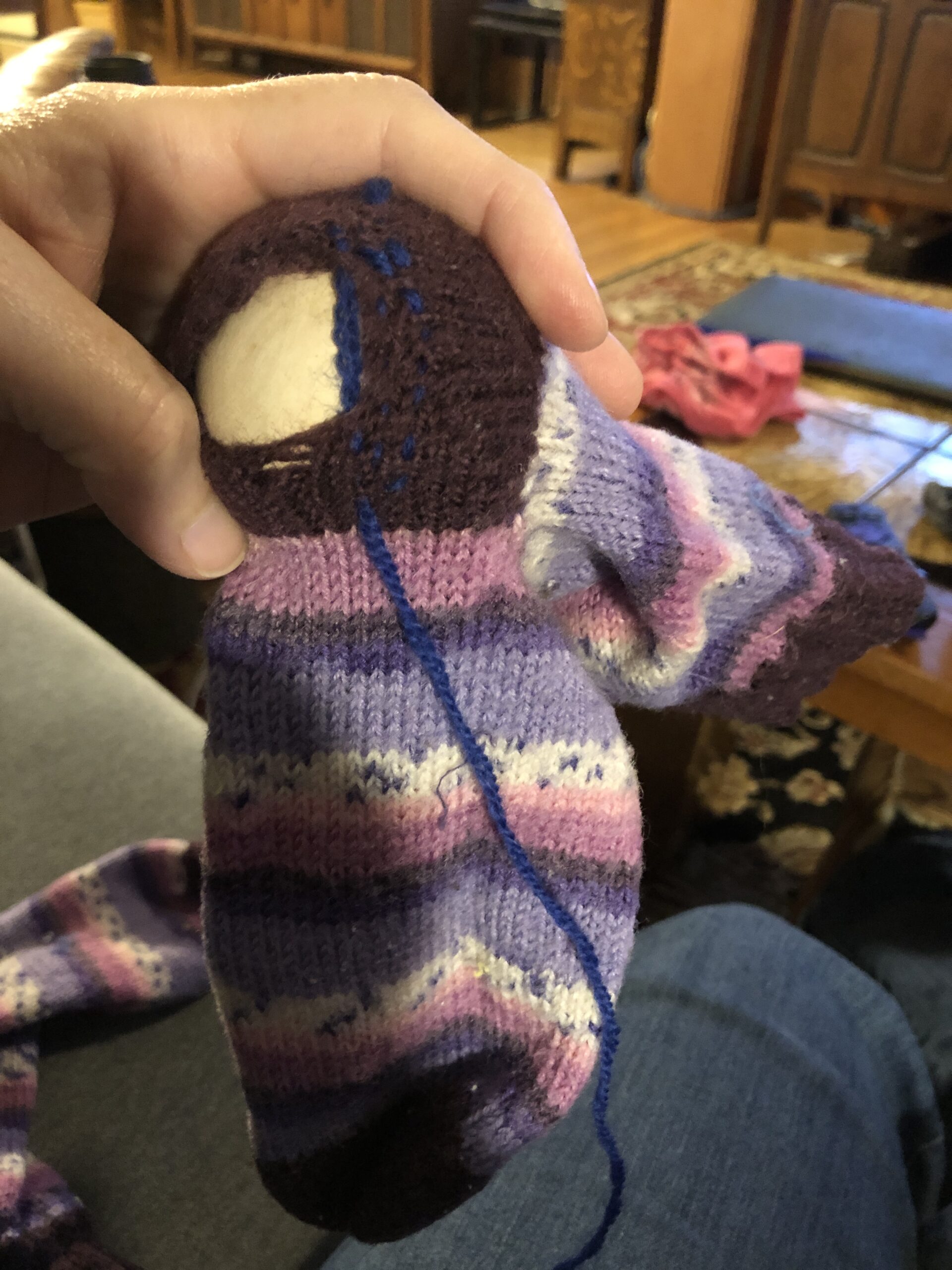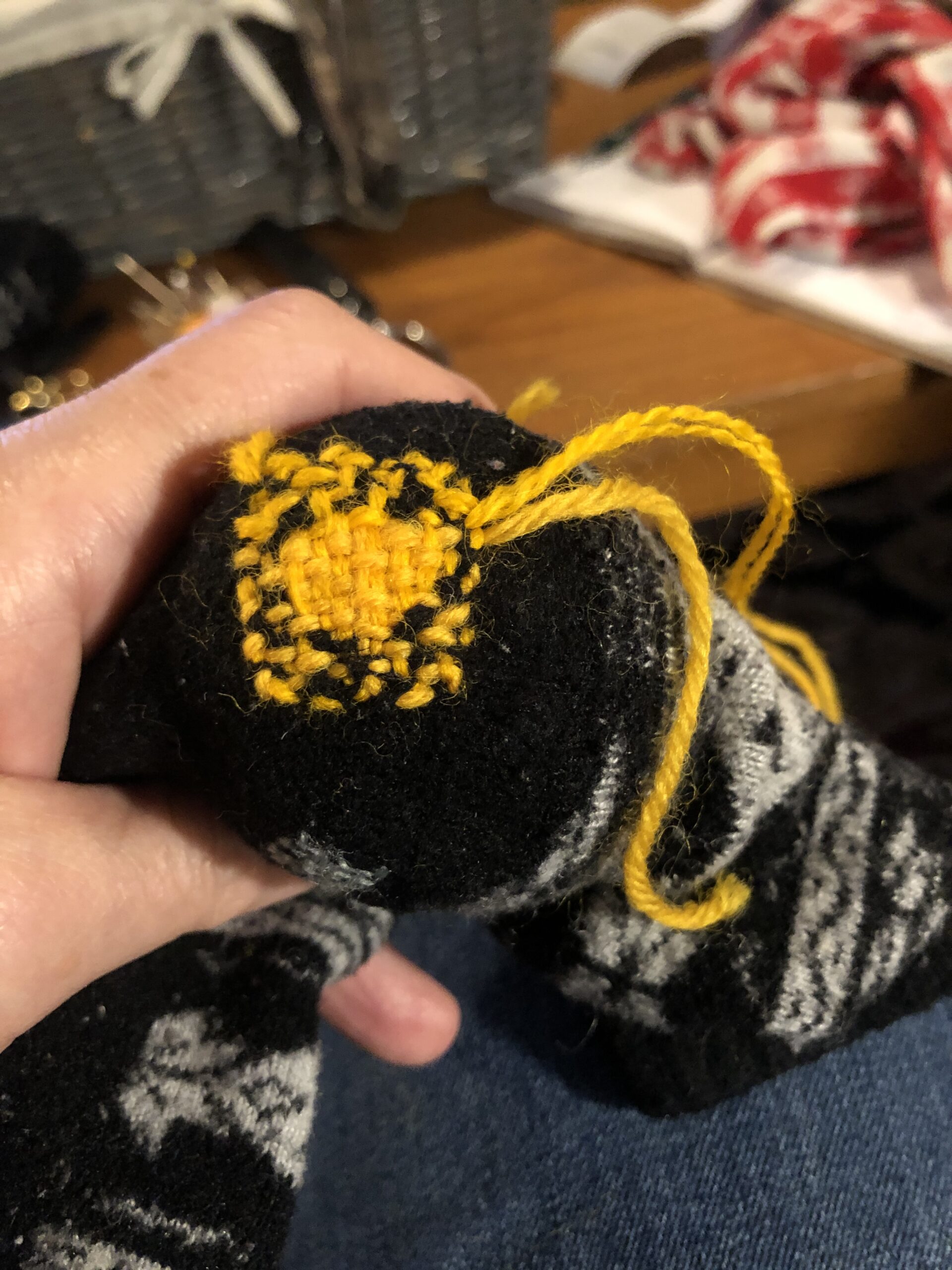 My favorite part of my darning marathon is that I used my recently thrifted maraca instead of my official darning egg, as the shape was rounder and the lighter color made it easier to see the weaving. Plus more fun to shake.